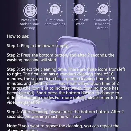 • Color: Purple• Package Includes: 1 x Portable Mini Washing Machine